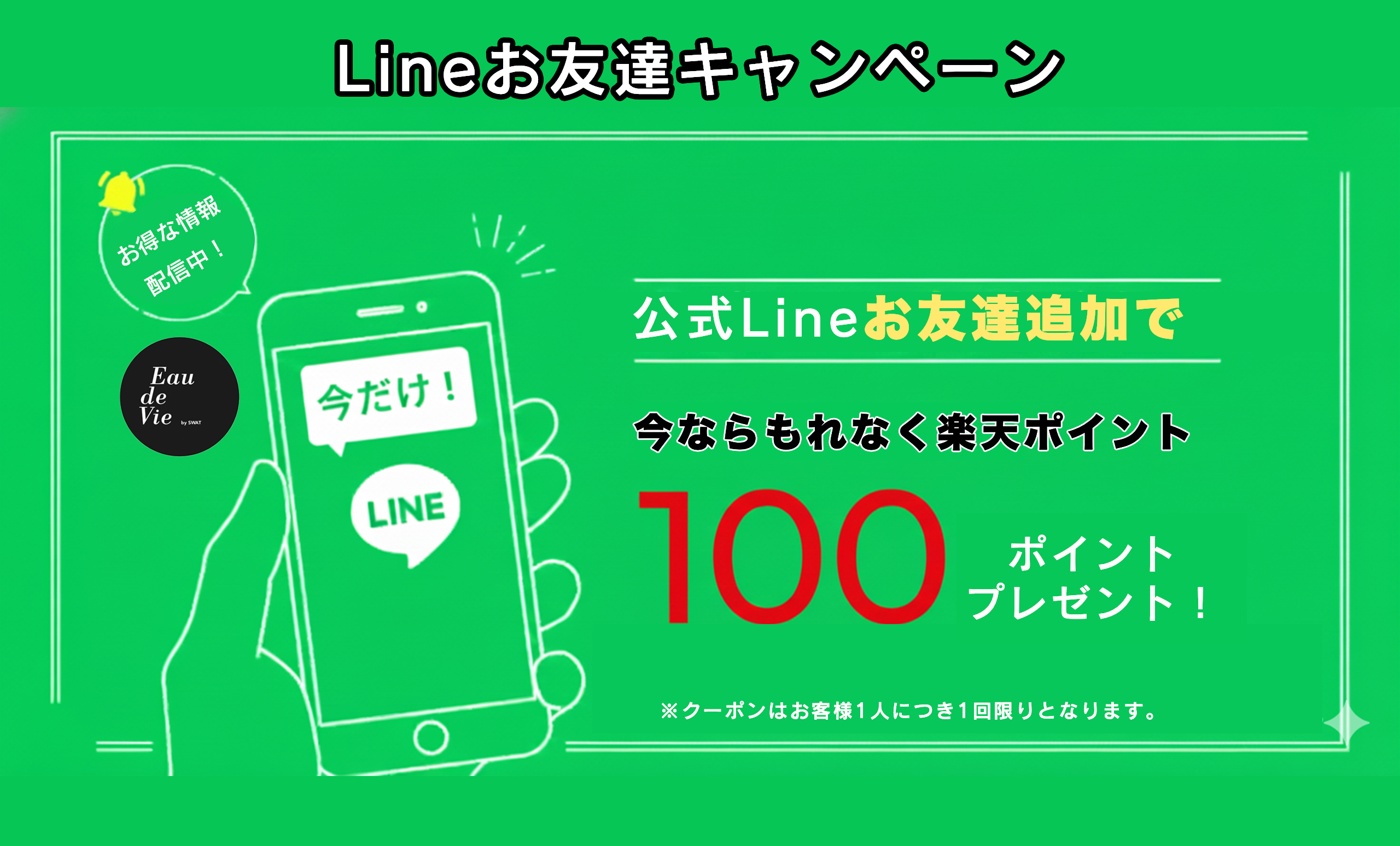 内容: Eau de Vie 公式LINEアカウントを友だち追加していただいた方全員に、楽天ポイント100ポイントをプレゼントいたします。